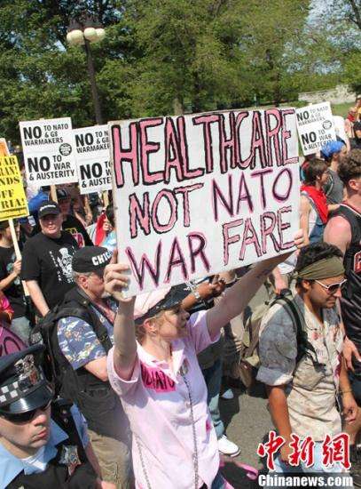 北約峰會5月20日在芝加哥開幕,萬余名示威者掀起規(guī)模空前的游行抗議活動。圖為當天游行中的一個場景,右側(cè)為正在執(zhí)勤的警察,中為一名美女示威者,左側(cè)為一名參加過阿富汗戰(zhàn)爭的美國退伍軍人。中新社發(fā)李洋攝