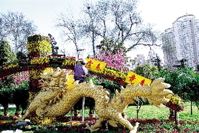 此次花展分別布置了“雙龍競春”、“綠島探春”等5個立體和平面花壇,有配花如牽?;ā⑷赖葍扇f余盆,另有袖珍葉子、散尾葵、綠茉莉、夏威夷等近千盆點綴,其中景點“樂童嬉春”的“魔方”使用7000余枝鮮切花康乃馨制成。