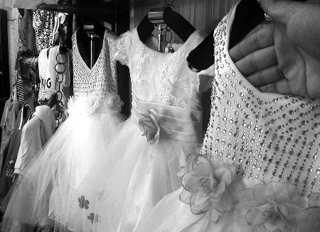 “這個送珍珠腰帶,走(賣)得可好,帶一件吧!”昨天下午2點,鄭州市豐產(chǎn)路某店鋪內(nèi),女老板正在向一位女士推銷熱賣的“公主裙”。仔細看,這條粉紅色的裙子,腰間綴著由花生米大小的“珍珠”做的腰帶,袖口邊緣處還貼著亮閃閃的貼片,看著確實華麗。經(jīng)過一番討價還價,該女士花100元為上幼兒園的女兒買了條裙子。令她不滿意的地方,就是似乎珍珠腰帶縫得并不緊,“珍珠是一根單線穿下來的,穿不了幾次,就該斷了”。