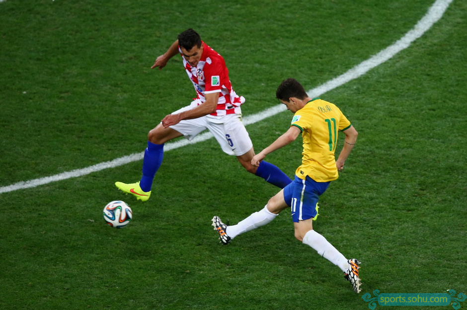 在巴西和克羅地亞的比賽最后時刻,拉米雷斯中場斷球,奧斯卡單騎闖關(guān),在禁區(qū)邊緣一記捅射再次洞穿普萊蒂科薩的十指關(guān),3-1,巴西鎖定勝局。最終,巴西隊憑借內(nèi)馬爾的2個進球,3-1逆轉(zhuǎn)克羅地亞贏得本屆世界杯的開門紅。圖為奧斯卡捅射瞬間