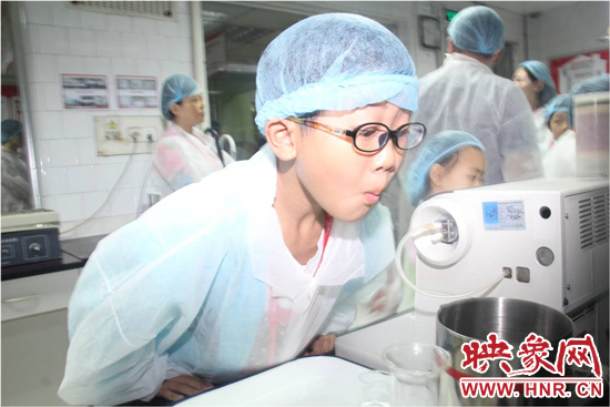 穿上白色的參觀服、戴上一次性帽子,受邀家庭進入了檢測區(qū),參觀了質(zhì)量控制的檢測工作流程。正在工作的品控員,現(xiàn)場邀請了一名小朋友進行了其中一項檢測--白利度檢測?!昂唵蝸碇v,就是利用密度儀,測試一瓶飲料的糖度和含氣量兩個指標。”品控員張青介紹道。