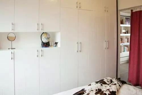 裝飾亮點(diǎn):臥室一側(cè)是整面墻的巨大衣柜,簡單的款式就能容納足夠多的衣物。衣物并沒有裸露在外,而是特地用柜門將其藏起,不僅能讓空間更為整潔,還能有效防灰防潮,讓空間變得亮眼。