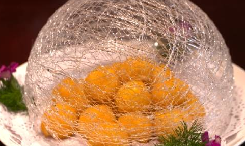 宛如藝術(shù)品一般的金玉滿堂,一上桌就抓人眼球。真正體現(xiàn)了店家精益求精,精雕細(xì)琢的態(tài)度。融化的冰糖織就像銀絲穹頂,覆蓋在“金球”之上使整道菜更添一絲朦朧。拿出一顆金黃的山藥球,咬開脆皮一股奶香便充斥口腔,奶香散盡后山藥泥的甘甜軟糯便呈現(xiàn)出來,滿口生津卻又香而不膩,非常適合女士。