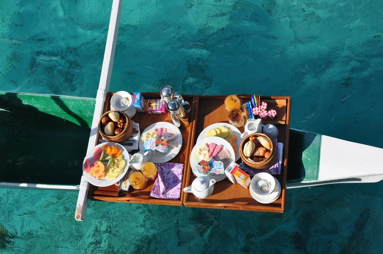 住在島上的水木屋里,睜開眼睛的時候,會有一對當(dāng)?shù)氐目∧忻琅?,劃著一艘獨木舟,送上濃香的咖啡,配上吐司和各色水果。?dāng)然這頓早餐價格不菲哦!