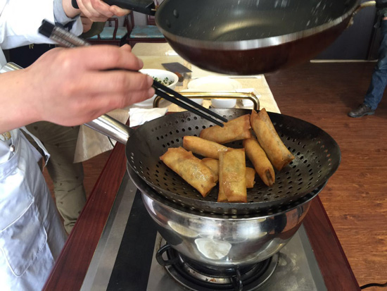 去皮五花肉剁成帶有顆粒感的肉餡,調(diào)好味道,炒熟、晾涼就可以用了。炒餡的時(shí)候師傅還用到了具有濃郁開封特色的調(diào)味料,肉餡炒好后韭菜的加入也是頗為講究的,最后像疊被子一樣將春卷包好,下鍋炸成金黃色就可以了!你看,這酥脆的外皮很誘人對(duì)不對(duì)!