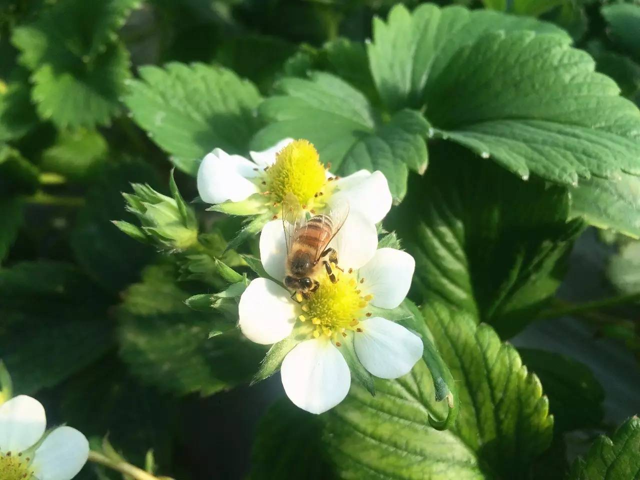 紅顏草莓是由優(yōu)質(zhì)草莓品種章姬和幸香雜交育成,它繼承了章姬的鮮甜和幸香的耐儲存,也因根基部顏色發(fā)紅得名。一進(jìn)棚,就聽到陣陣的嗡嗡聲。潔白的草莓花上,小蜜蜂展著透明的翅膀正忙著采蜜。據(jù)說經(jīng)過蜜蜂授粉良好的花朵才能長出個頭飽滿勻稱的草莓。