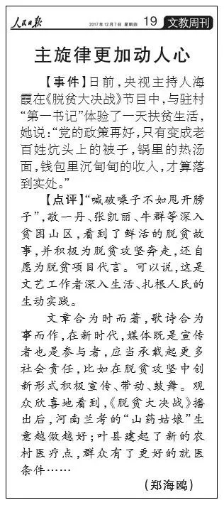 評論中還指出,文章合為時而著,歌詩合為事而作,在新時代,媒體既是宣傳者也是參與者,應當承載起更多社會責任,比如在脫貧攻堅中創(chuàng)新形式積極宣傳、帶動、鼓舞。觀眾欣喜地看到,《脫貧大決戰(zhàn)》播出后,河南蘭考的“山藥姑娘”生意越做越好;葉縣建起了新的農(nóng)村醫(yī)療點,群眾有了更好的就醫(yī)條件……