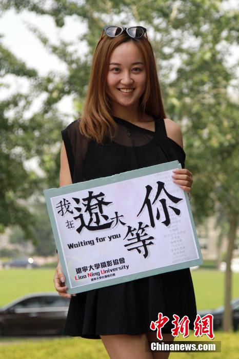 6月23日,美女拿著“我在遼大等你!的牌子在拍照。當日, 遼寧大學攝影協(xié)會推出一組遼大創(chuàng)意“招生名片”照片,在網絡爆紅出鏡的數(shù)位帥哥靚妹抓人眼球。中新社發(fā) 于海洋 攝