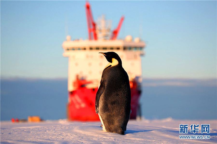 南極企鵝“圍觀”雪龍?zhí)柨瓶即?/p>