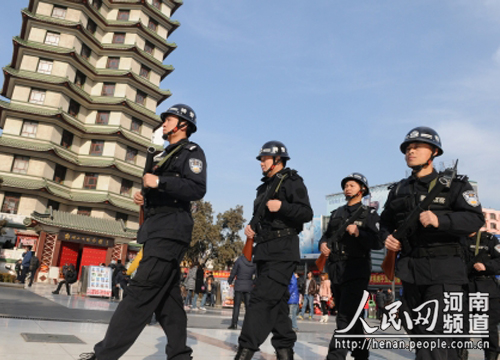 從1月31日起開始至大年初八,鄭州特警將奔赴市區(qū)各大廣場(chǎng)和主干道開展武裝巡邏,為綠城守歲。